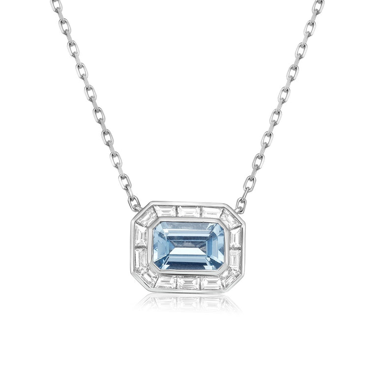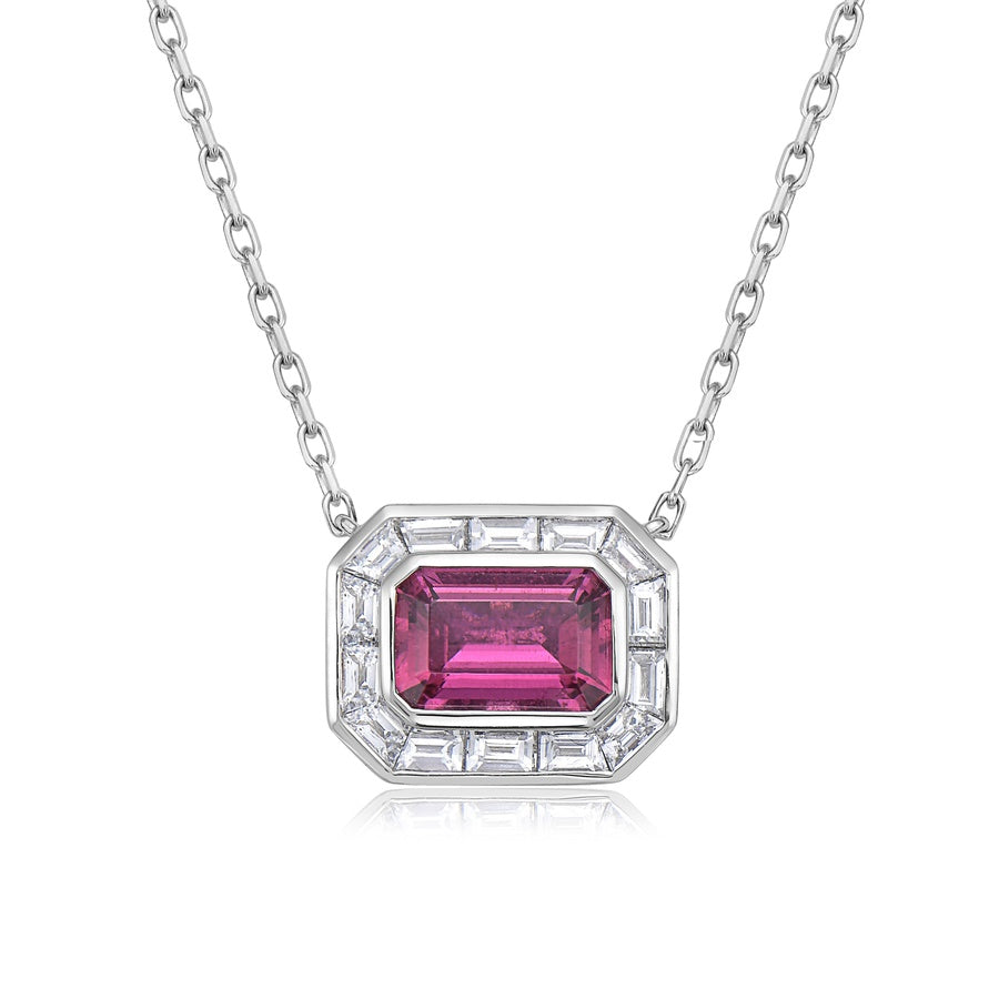 A gorgeous emerald-cut Rubellite is set in an east-to-west fashion, framed by precision-cut white diamond baguettes, all set in lustrous 18k white gold. The rich, deep red and pink hue of the rubellite, paired with the sleek, angular beauty of the diamond baguettes, creates a striking and elegant design that exudes timeless sophistication.