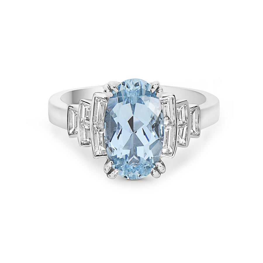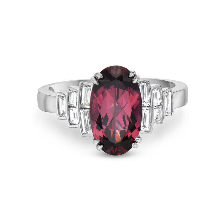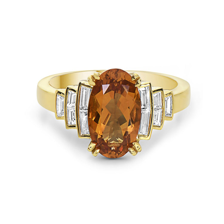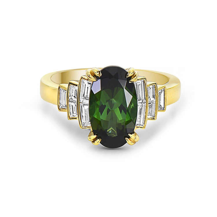 A solitaire green tourmaline oval is set in a sculptural 18k yellow gold setting, featuring three rows of custom-cut white diamond baguettes on the sides. This design captures the essence of an Art Deco cocktail ring, blending the rich green of the tourmaline with the warm glow of yellow gold and the bold, geometric elegance of the diamonds for a striking and timeless statement piece. (Small Version)