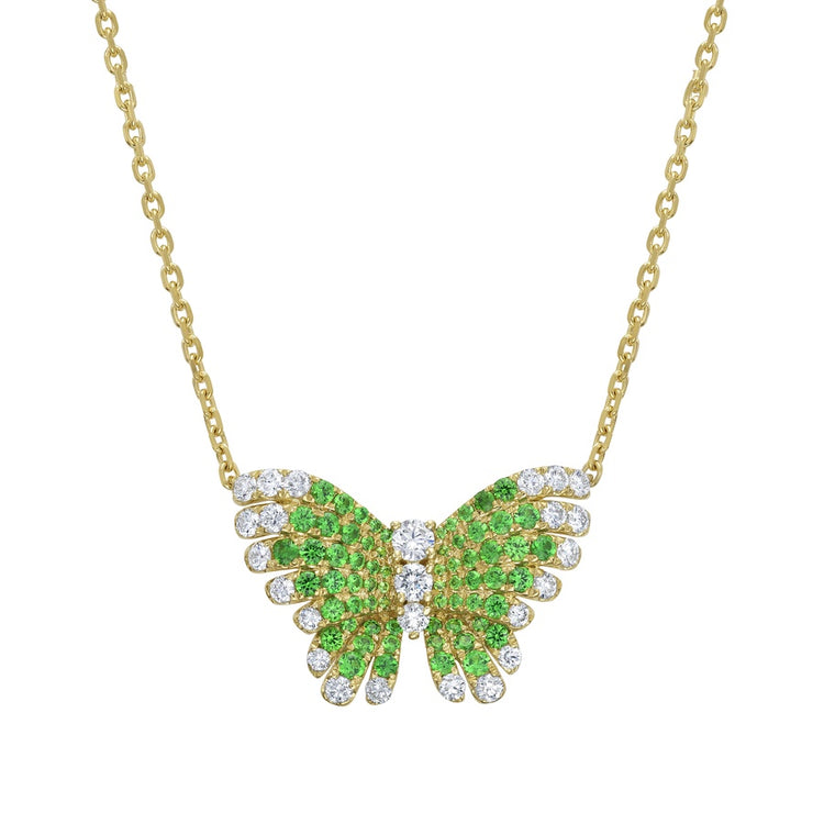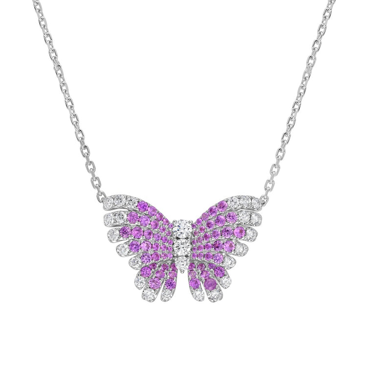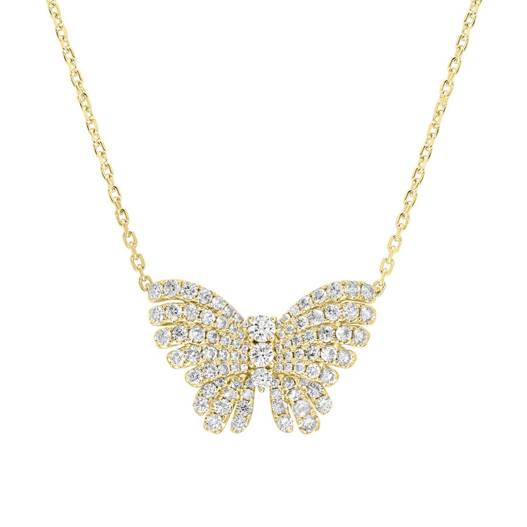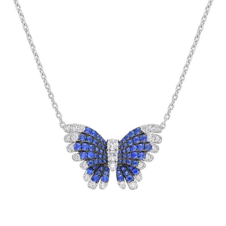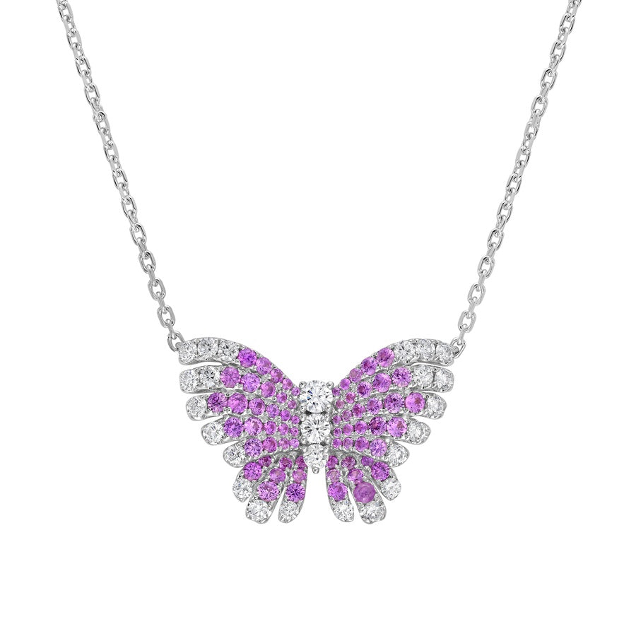 Arms of 18k white gold come together to form graceful butterfly wings, adorned with brilliant white diamonds. This sculptural butterfly pendant combines form and texture, bringing the delicate beauty of nature to life in a bold, wearable work of art.