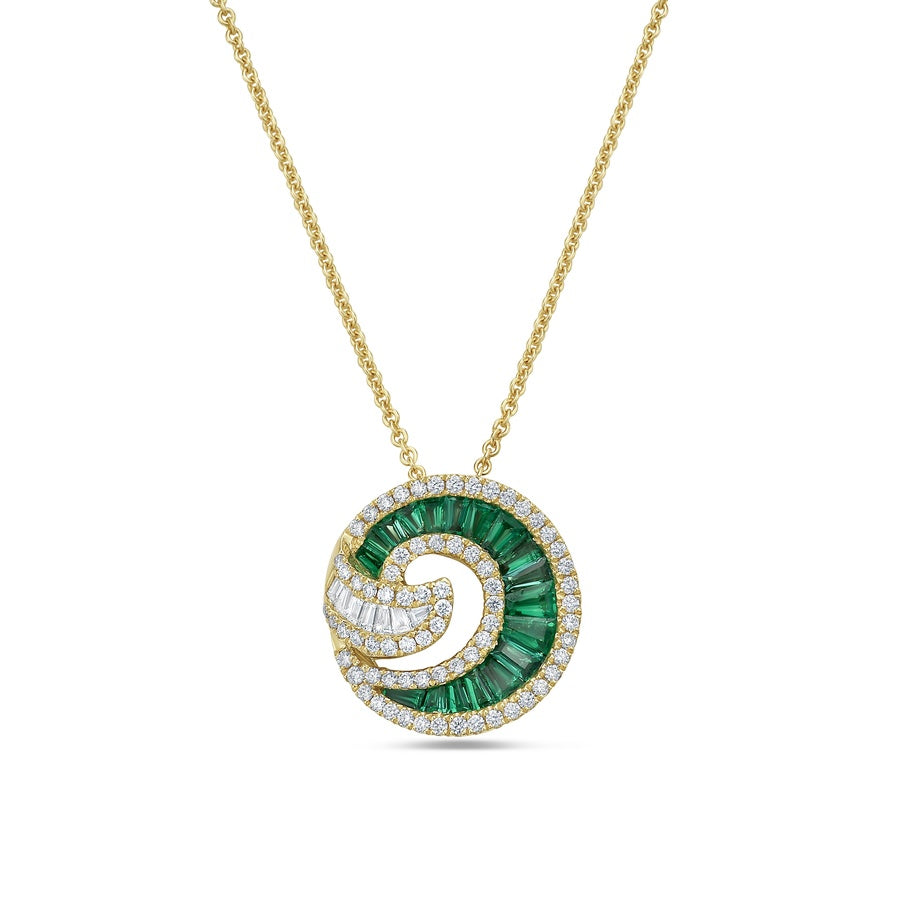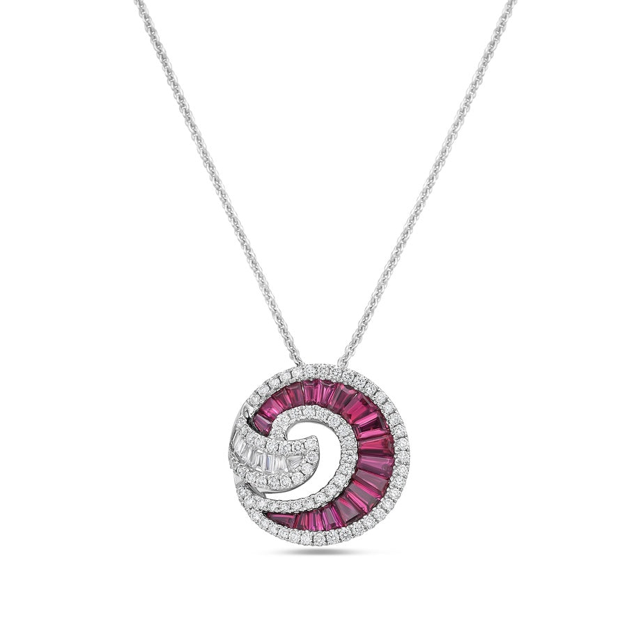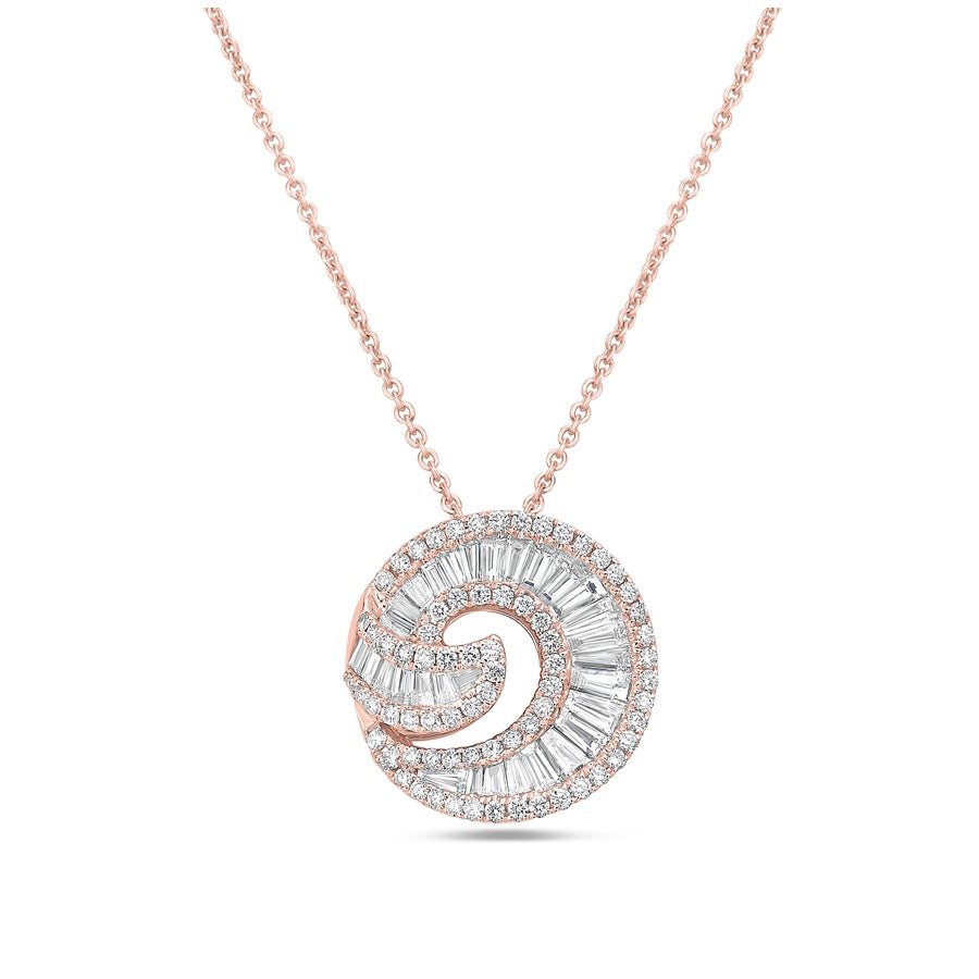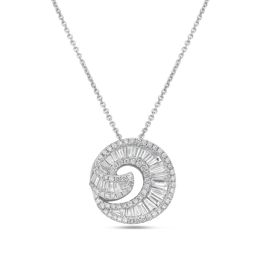 Sculptural diamond pendant from our signature collection, set in 18k white gold. Perfectly cut and tapered baguette diamonds twist effortlessly, evoking the shape of a nautilus shell.