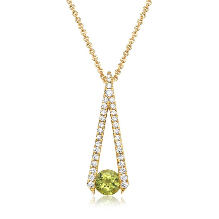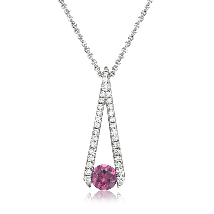 A beautiful round garnet stone is gracefully held between two sections of 18k white gold, set with brilliant diamonds. The gold sections split at the top, opening to hold the garnet, creating a unique and eye-catching pendant.
