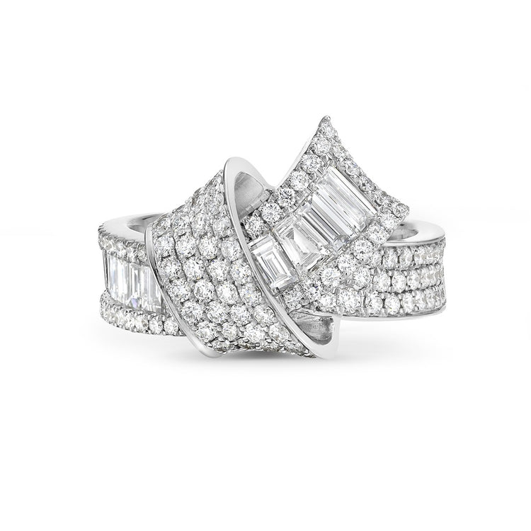 A ribbon of channel-set diamond baguettes is elegantly tied together with an expertly set section of pavé white diamonds. The two strands converge in a knot of true embrace. Set in 18k white gold, this design showcases sculptural form and dimension, creating the illusion of the piece being gracefully pulled through itself.