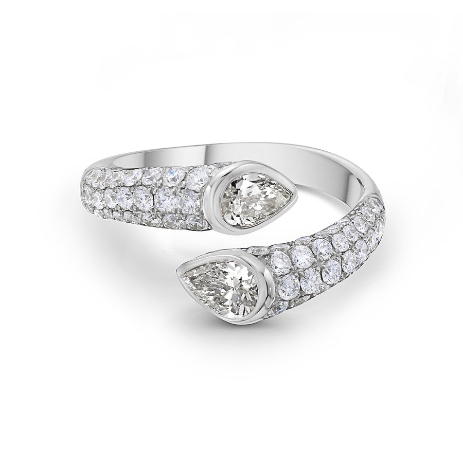 Two opposing pear shape diamonds set in 18k white gold bezels accented by brilliant pavé white diamonds create this dramatic bypass style ring.