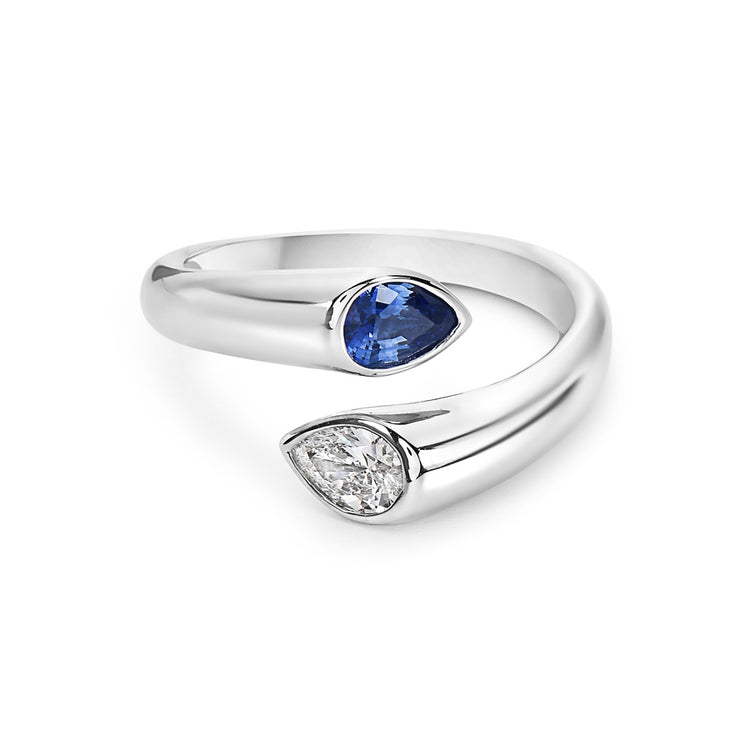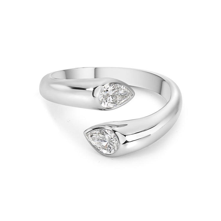 Solid 18k white gold bypass ring from the reflection collection featuring two pear shape bezel set white diamonds