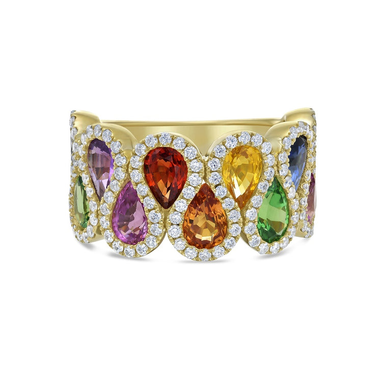 Set in 18k white gold, pear-shaped brilliant diamonds are artfully arranged in an alternating pattern, each perfectly nestled into the next. A ribbon of pavé white diamonds gracefully weaves between the stones, creating a captivating diamond band ring that shimmers with flowing brilliance.