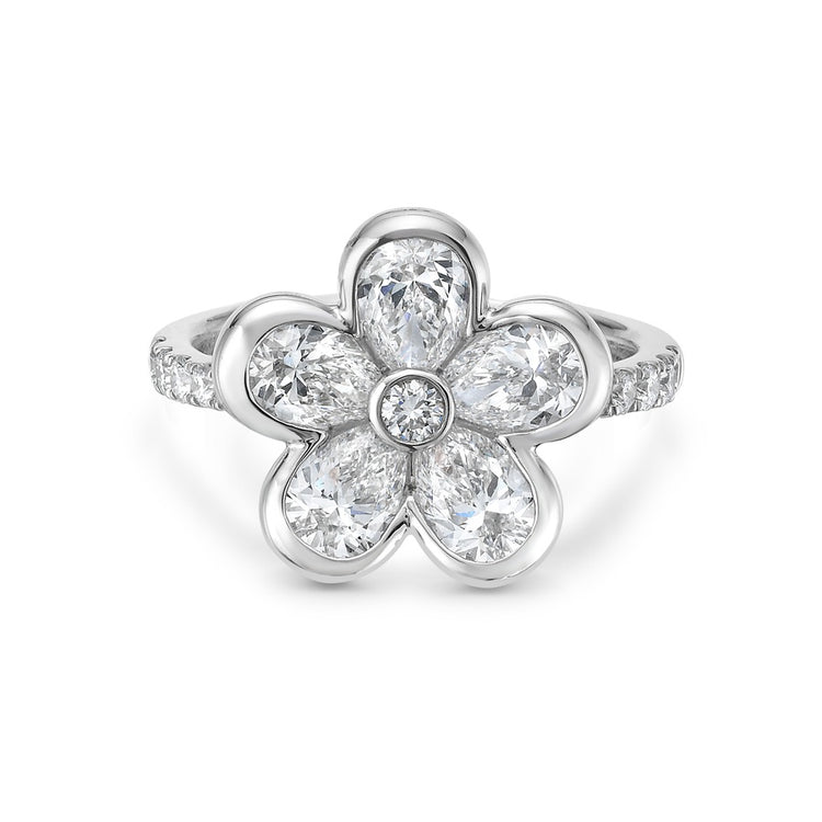 A breathtaking floral ring crafted from five full-cut pear-shaped brilliant diamonds surrounding a round center diamond, all semi-bezel set in 18k white gold. The semi-bezel setting enhances the diamonds’ brilliance, bringing the elegant flower-inspired design to life.