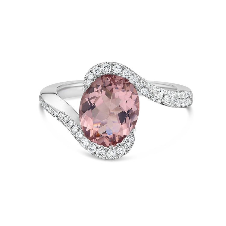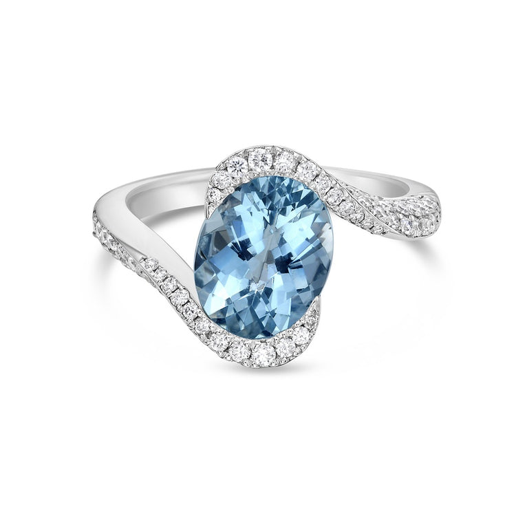 Meticulously set pavé diamonds in 18k white gold gracefully wrap around and hold an oval aquamarine. The two arms of pavé diamonds beautifully twist up the shank, giving the ring both form and captivating movement.