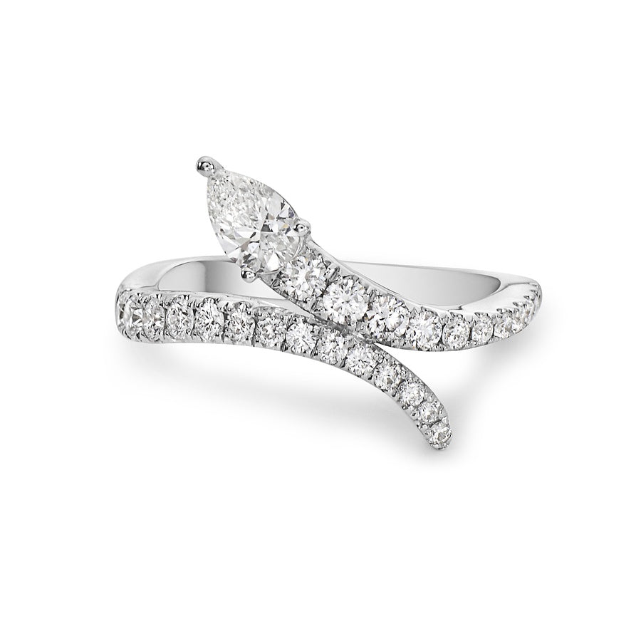 Brilliant white diamonds set in 18k white gold gracefully encircle the finger, complemented by a captivating pear-shaped diamond solitaire to create this modern interpretation of a classic snake ring.