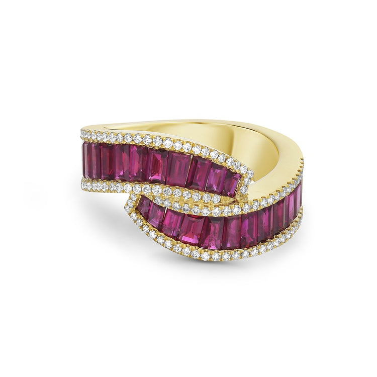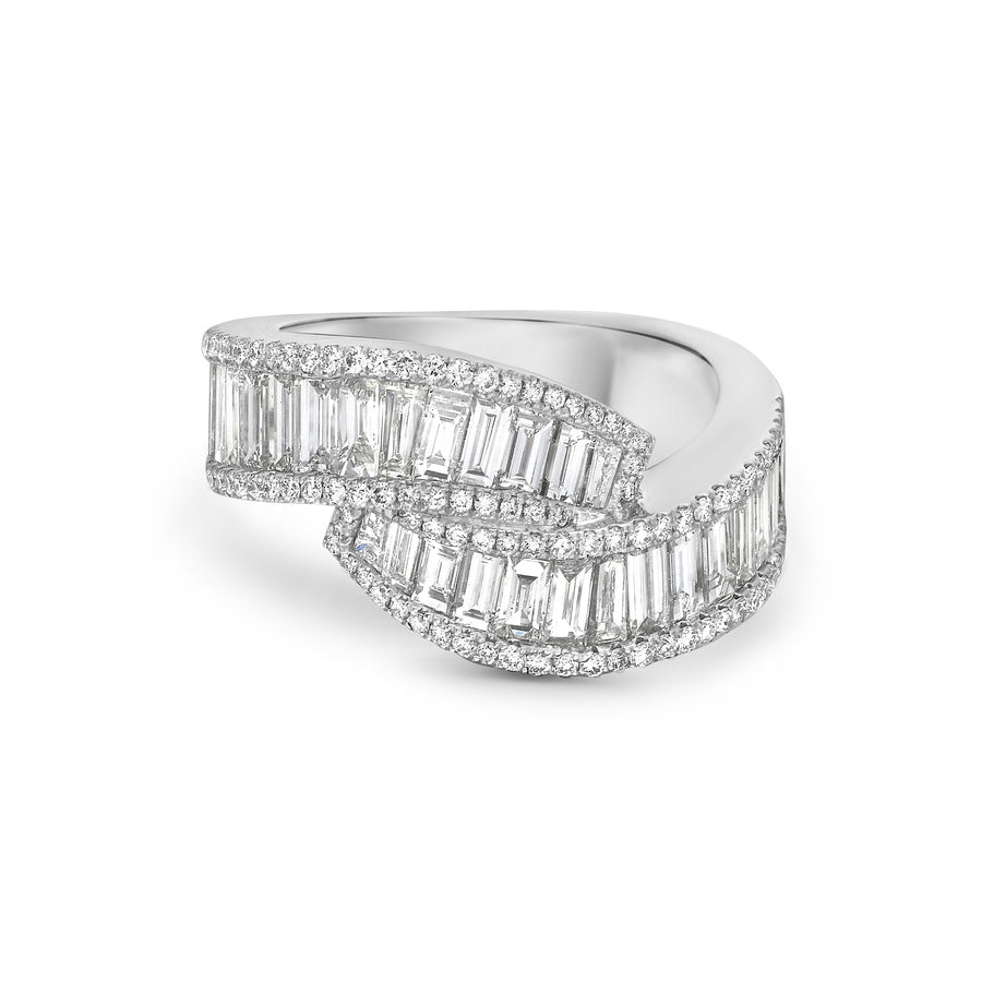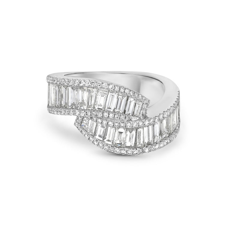 Custom-cut white diamond baguettes are expertly channel-set between two walls of white diamonds in 18k white gold, creating an abstract and romantic design.