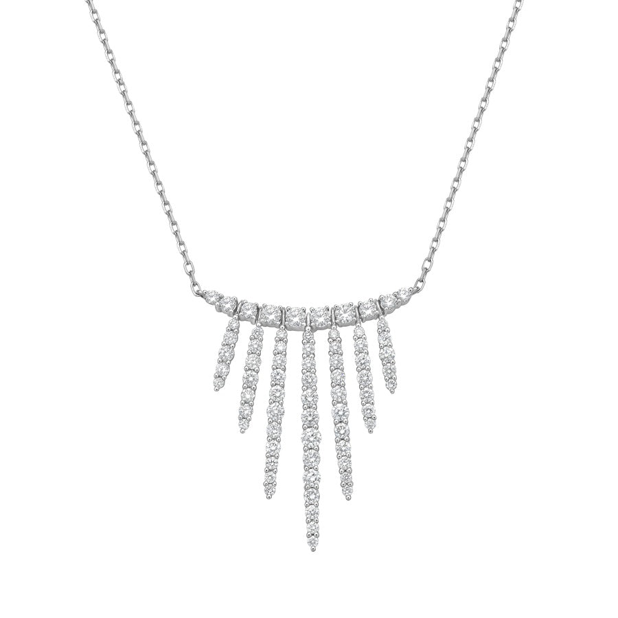 Sophisticated yet fun, this look radiates glamour with brilliant diamonds set in 18k white gold. Bars of diamonds graduate and cascade downward, creating an effortless statement pendant.