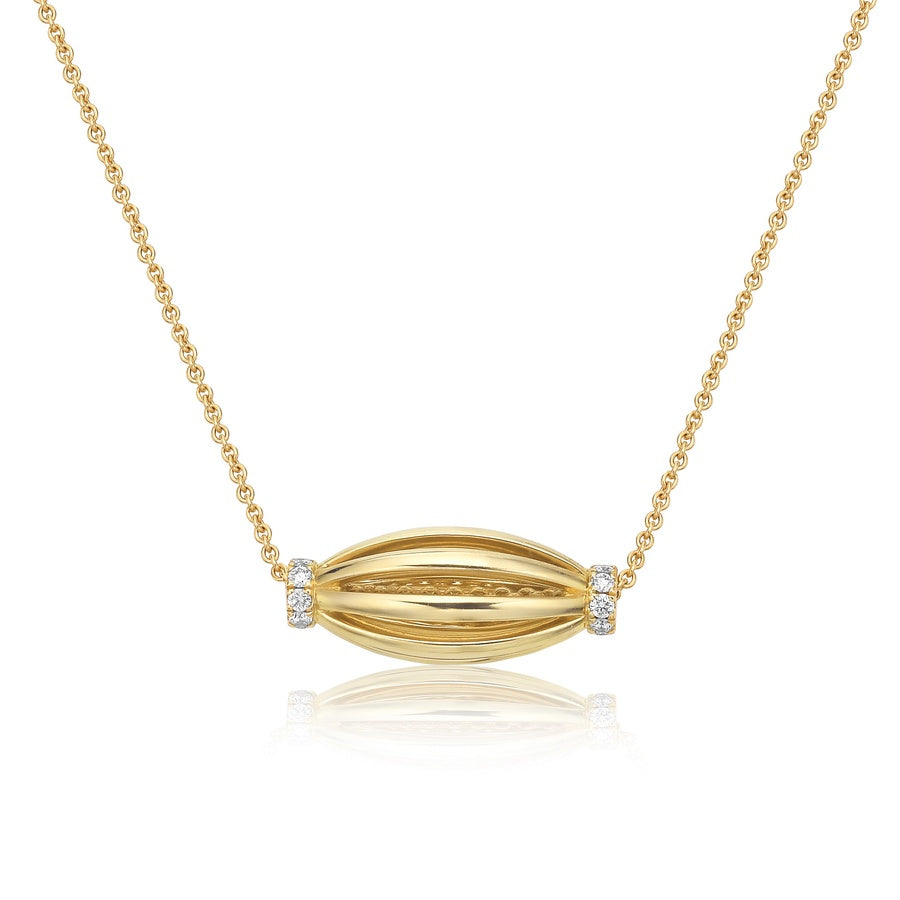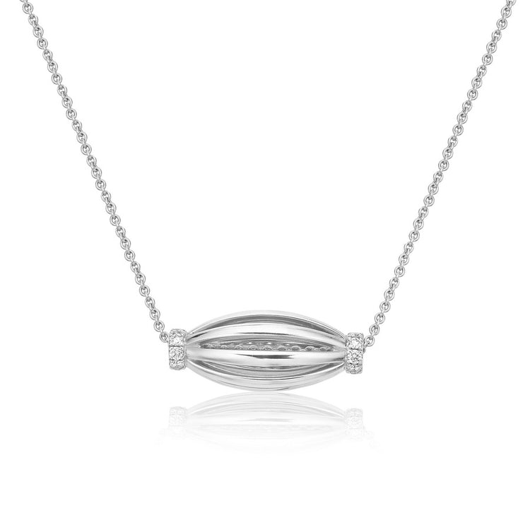 Enjoy modern elegance with this graduated birdcage pendant, expertly crafted in luxurious 18k white gold. Two delicate lines of pave diamonds bridge the design, subtly adding sparkle while allowing the gold to shine.