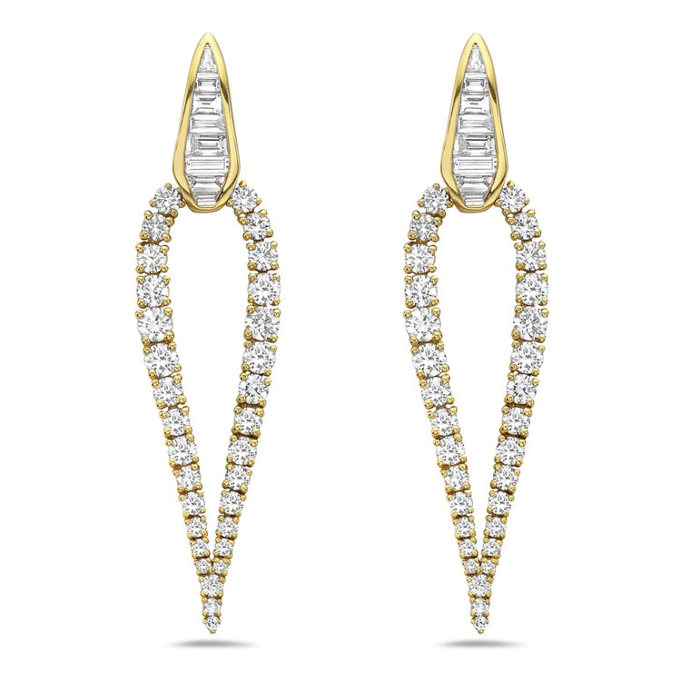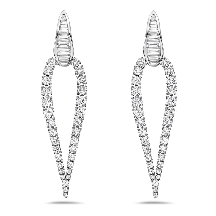 Brilliant white diamonds set in 18k white gold taper down to a dramatic point, leading to a sleek channel-set baguette station that anchors the design. This striking composition creates a bold and unforgettable statement earring.
