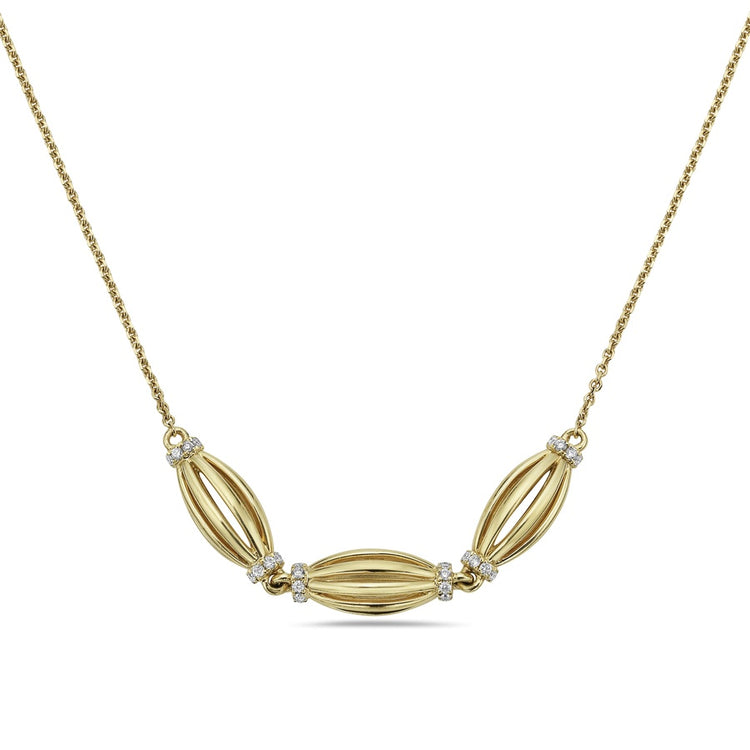 Enhance your elegance with this stunning three station tapered birdcage necklace, expertly crafted in luxurious 18k white gold. Accented with delicate lines of pavé diamonds, this design adds subtle sparkle while allowing the warmth of the gold to take center stage.