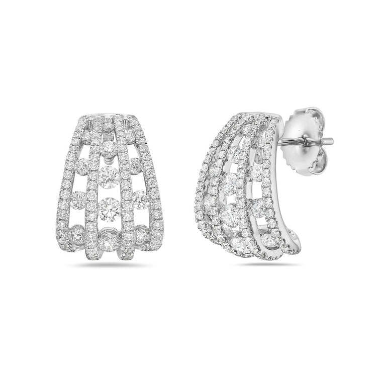 Three rows of brilliant white diamonds are elegantly nestled between precision-set pavé diamond walls, all crafted in luxurious 18k white gold. This stunning huggie earring is a timeless design, destined to become a cherished staple in your jewelry collection.