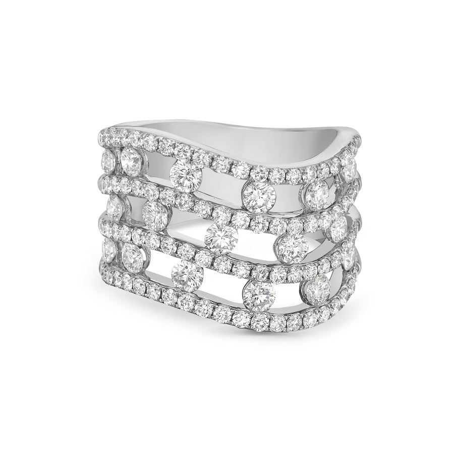 Three rows of ideal-cut white diamonds are nestled between walls of 18k white gold and shimmering pavé, curving gracefully to evoke a sense of fluid movement around the finger.