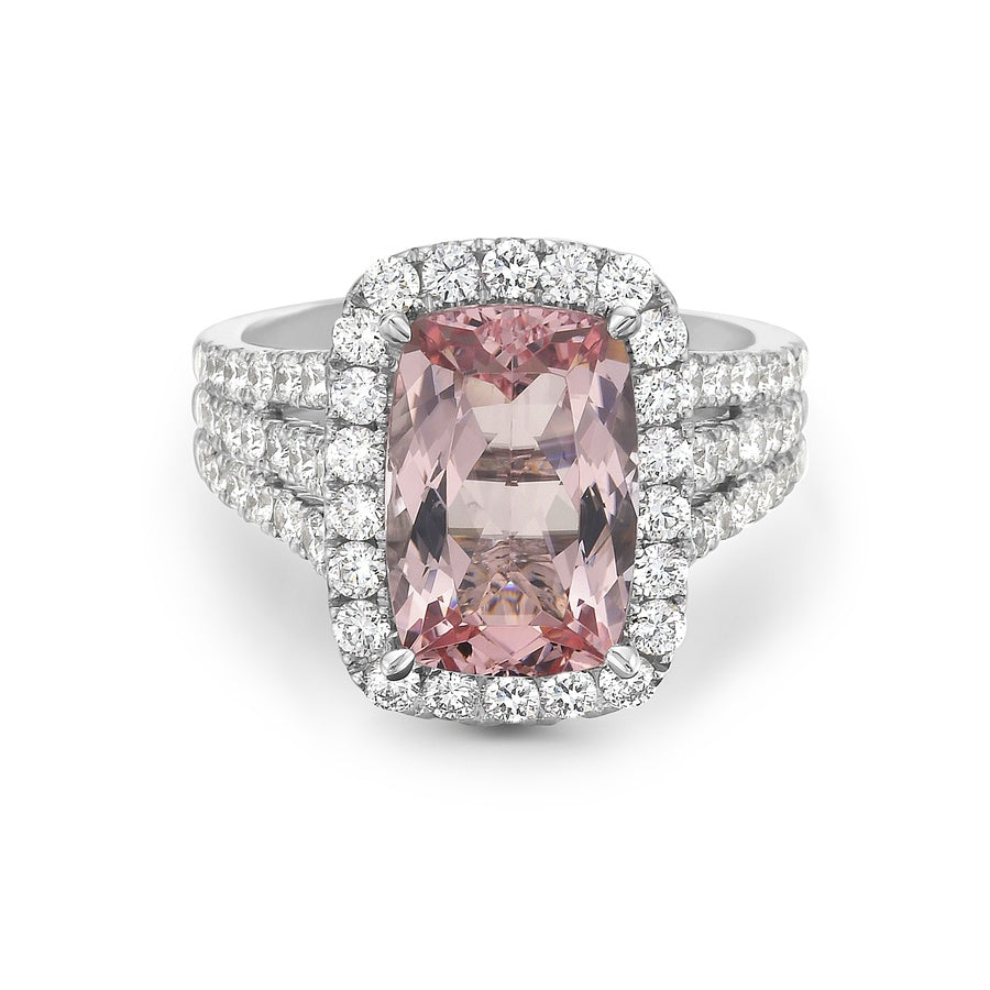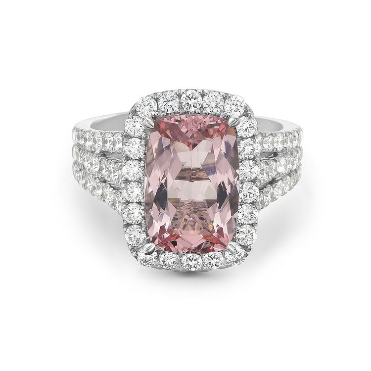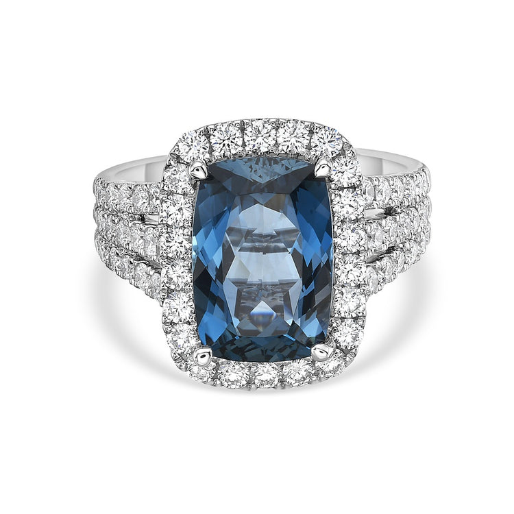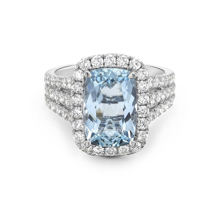 Three rows of calibrated brilliant white diamonds gracefully converge around a stunning cushion-cut aquamarine center stone, encircled by a delicate diamond halo, all set in 18k white gold. The design is further enhanced by a hidden blue sapphire detail, adding a soft pop of color and elegance to this beautiful, timeless piece.