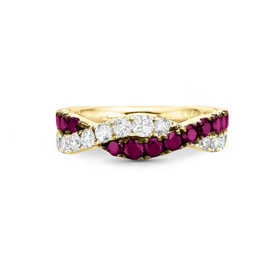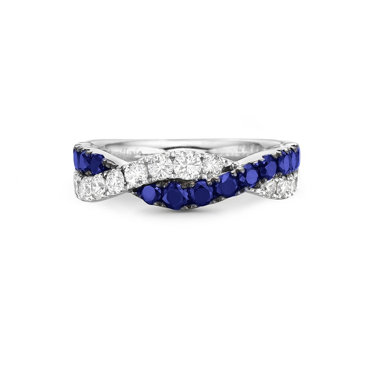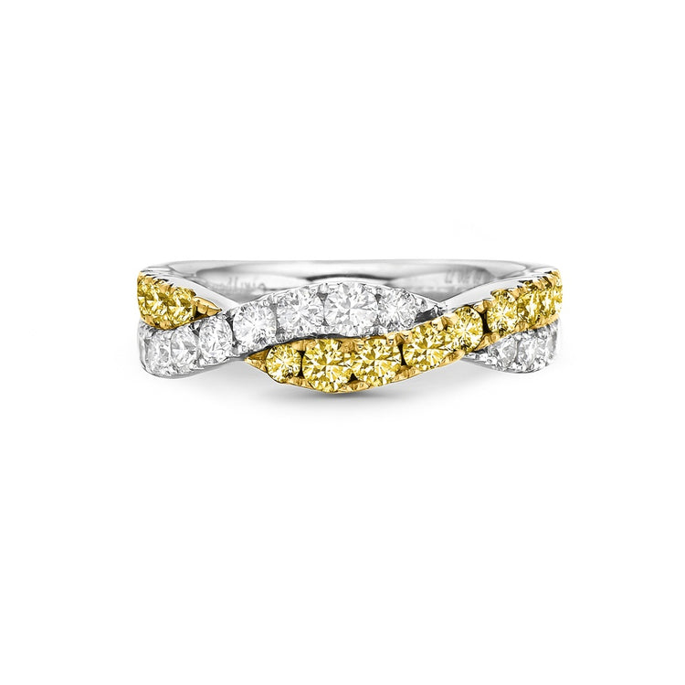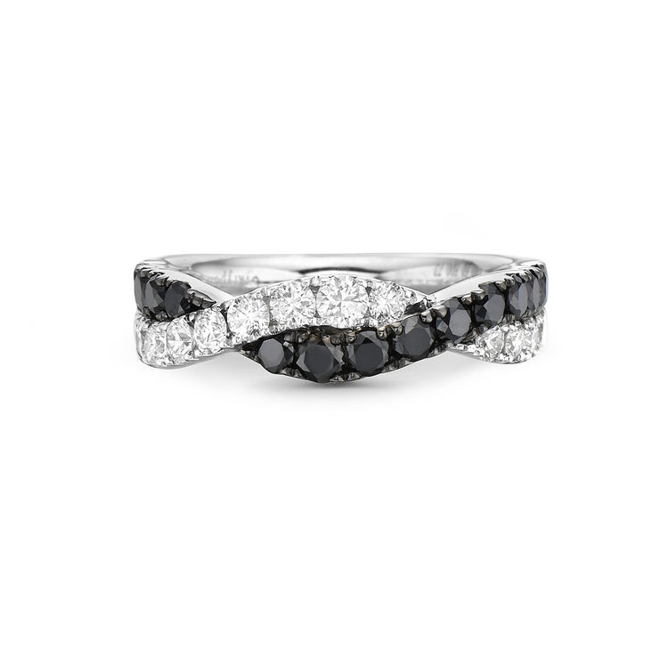 Brilliant white diamond bands set in platinum intersect and intertwine, crafting a visually striking and dimensional ring.