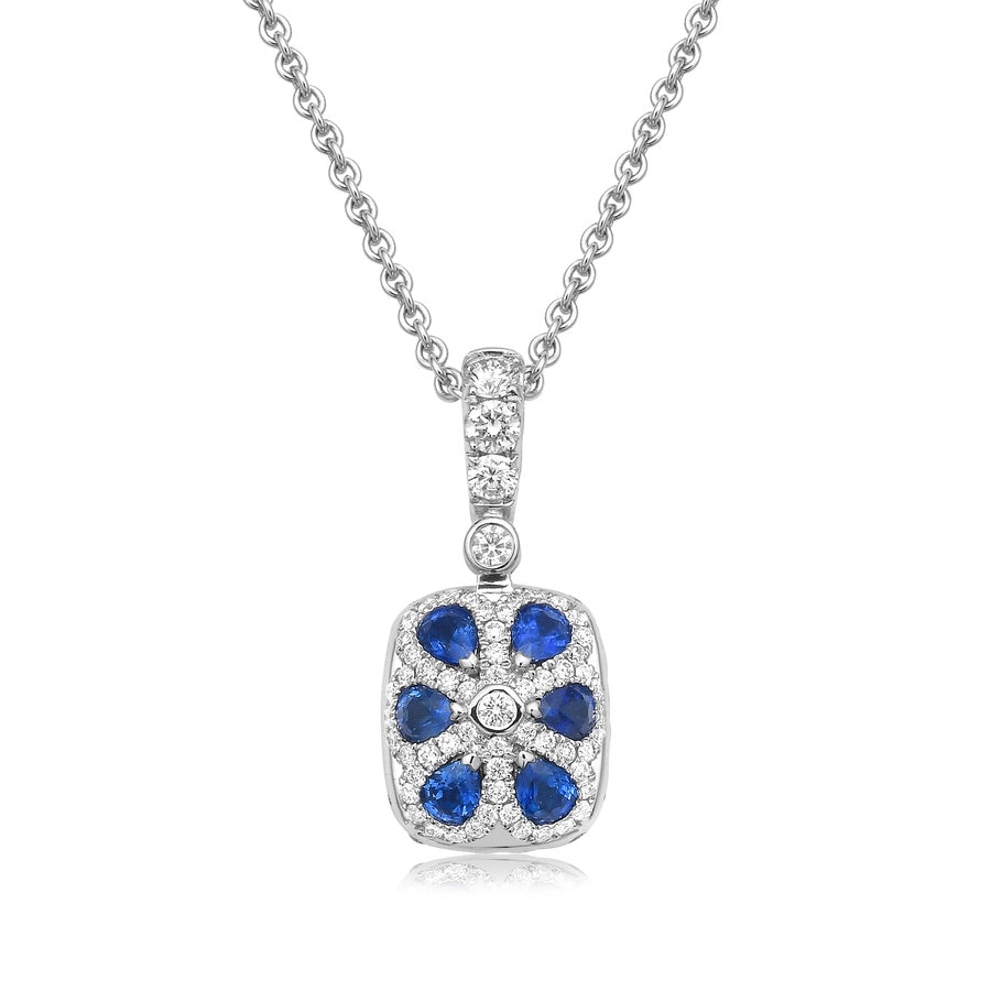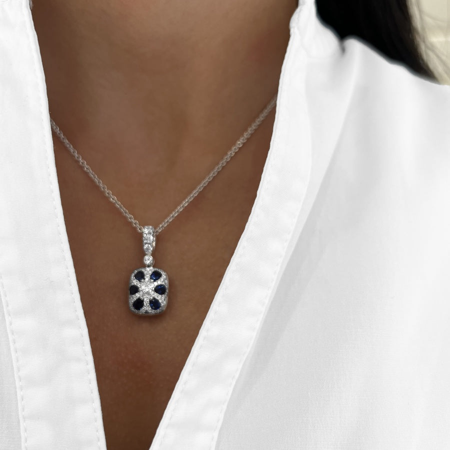 Vibrant cushion-cut blue topaz pendant, set in 18k white gold, is encircled by a halo of brilliant diamonds, creating a dazzling frame. Attention to detail is evident from every angle, with the back of the pendant featuring vibrant blue sapphires, adding a unique and thoughtful touch.