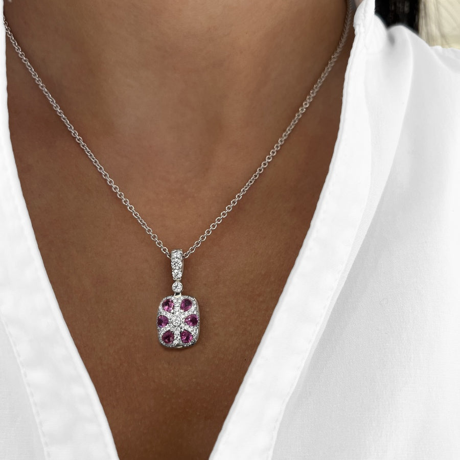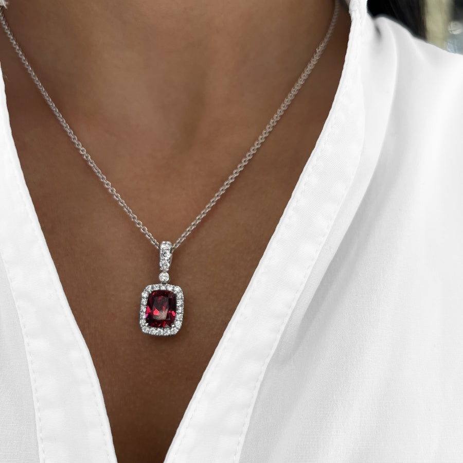Vibrant cushion-cut garnet pendant, set in 18k white gold, is encircled by a halo of brilliant diamonds, creating a dazzling frame. Attention to detail is evident from every angle, with the back of the pendant featuring vibrant pink sapphires, adding a unique and thoughtful touch.