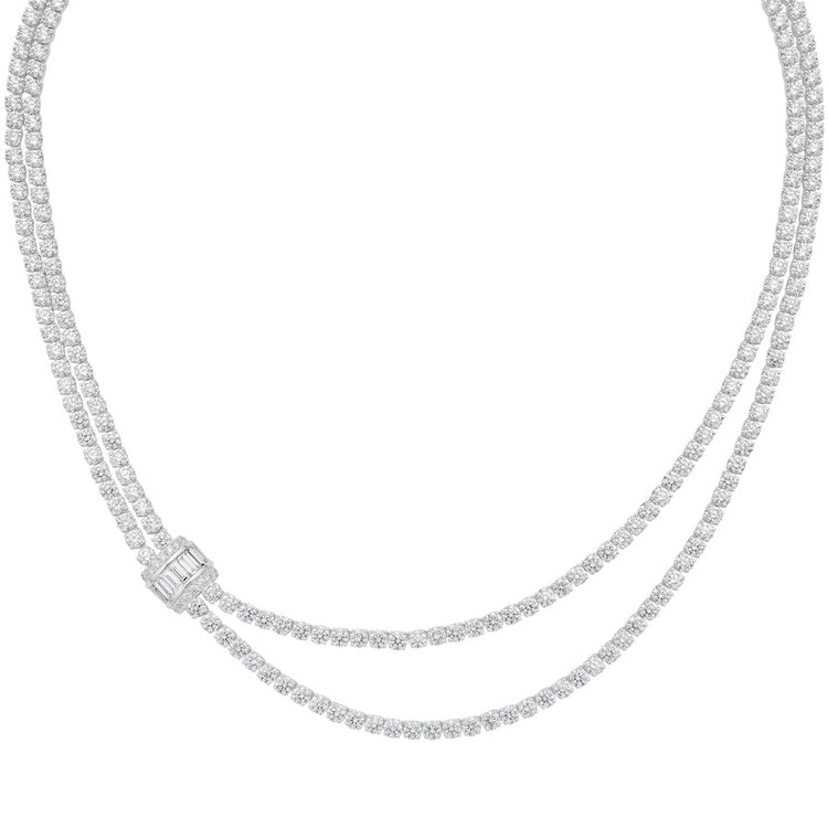 Two rows of brilliant white diamonds, set in 18k white gold, drape gracefully along the neckline. An asymmetrical baguette diamond station gently pinches the two strands together, creating a refined focal point that adds elegant structure and modern sophistication.