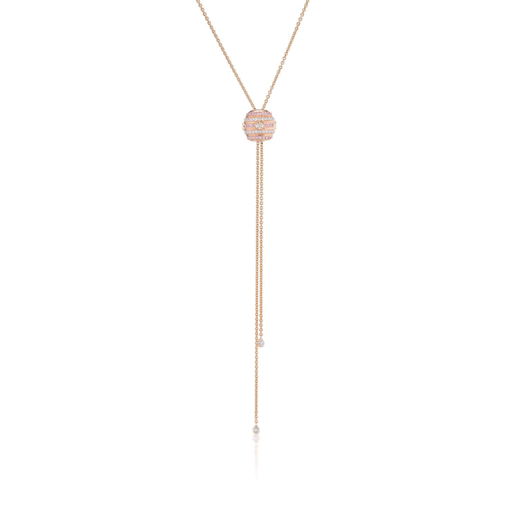 The adjustable lariat-style chain allows for versatility in styling, making it suitable for both casual and formal occasions. It's a piece that can be worn close to the neck or adjusted to drape gracefully.