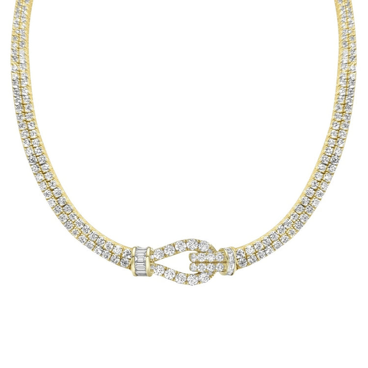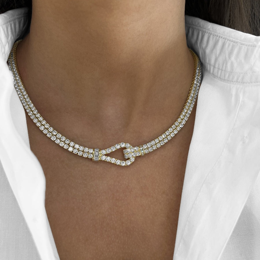 Two layers of round brilliant diamonds set in 18k yellow gold gracefully ascend around the neck, coming together in a sculptural lasso design—one side elegantly gripping the lasso, evoking a sense of tension and movement.