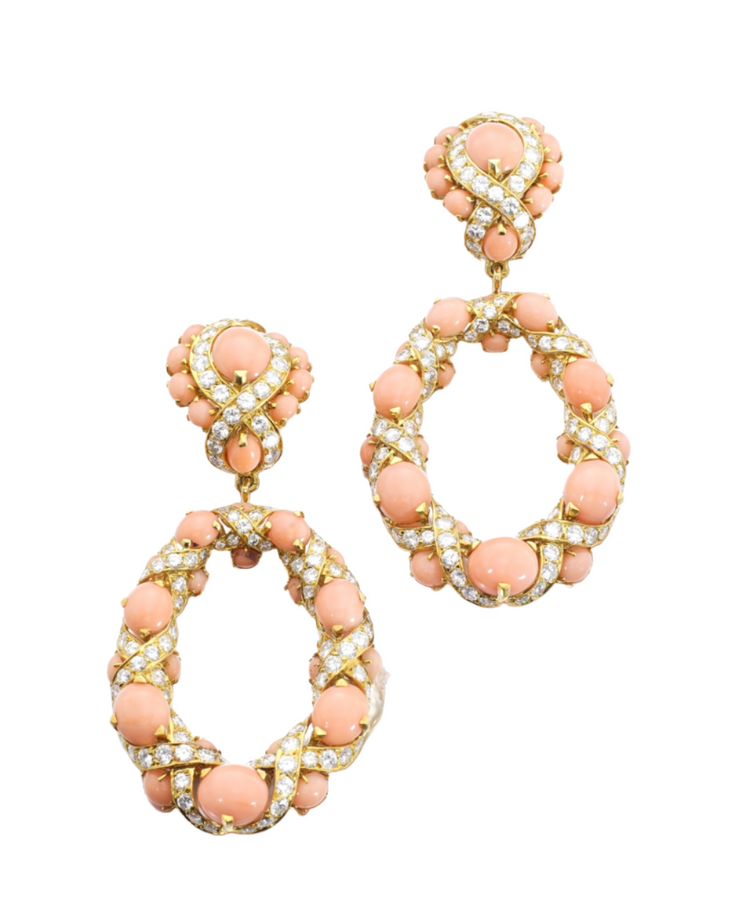 These dramatic pink coral and white diamond earrings are sure to be the statement of any event. Consisting of 46 round shaped peach-pink coral pieces and wrapped around with brilliant round white diamond ribbons, there is nothing simple about these earrings.