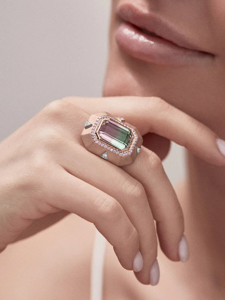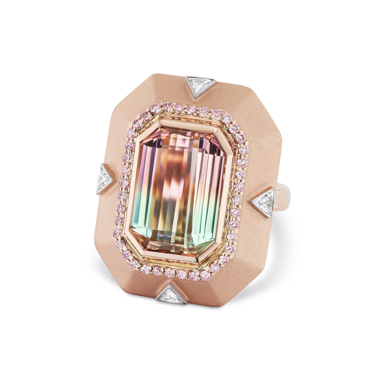 This stunning ring offers a one-of-a-kind look. The center stone, a 6.97 carat bi-color tourmaline dazzles in a pink and white gold setting with four trillion-cut white diamonds and accented with Argyle Pink Diamonds. Elegant and unique, this ring is sure to make a statement.