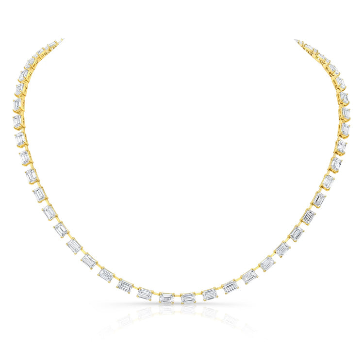 Make an entrance that will get heads turning and people talking! A splendid necklace studded with over 20 carats of emerald cut diamonds on a sumptuous yellow gold chain. Your jewelry box will thank you!