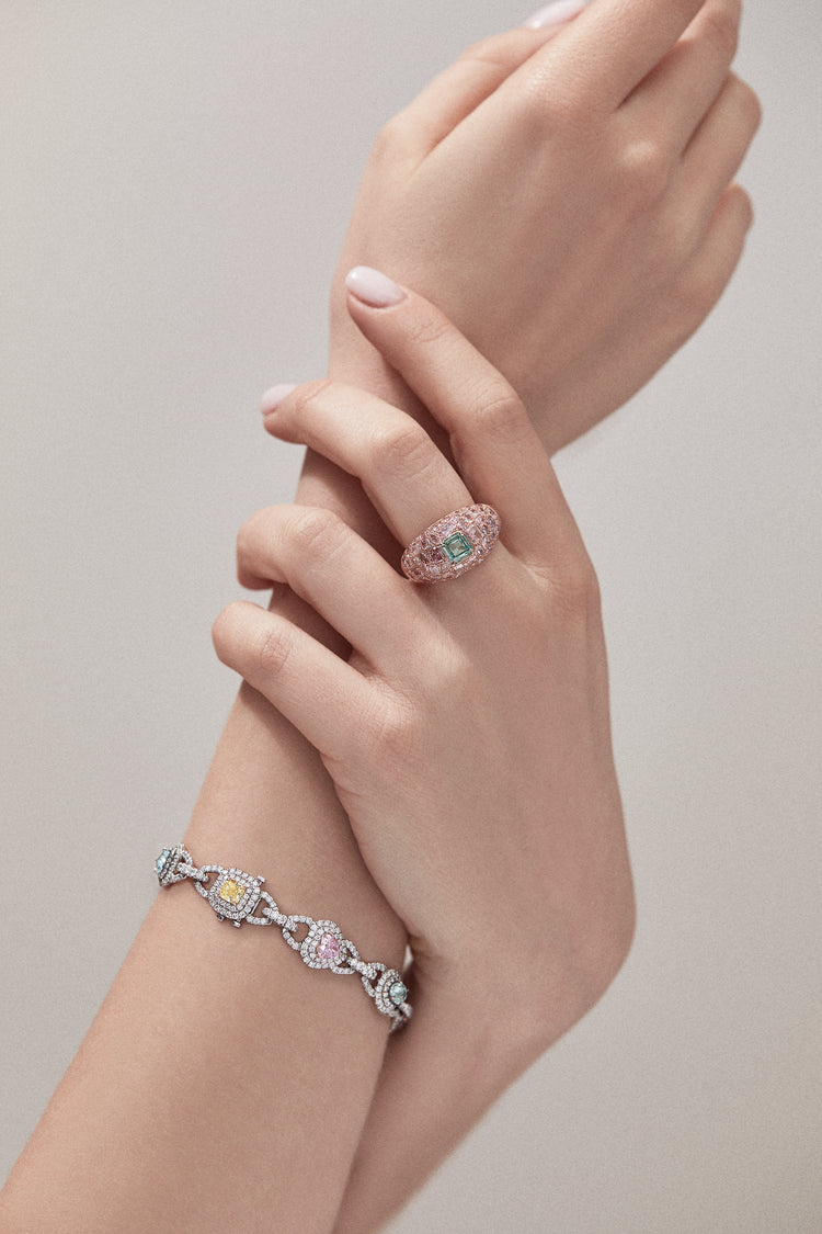 J Fine Bluish Green and Pink Diamond Dome Ring