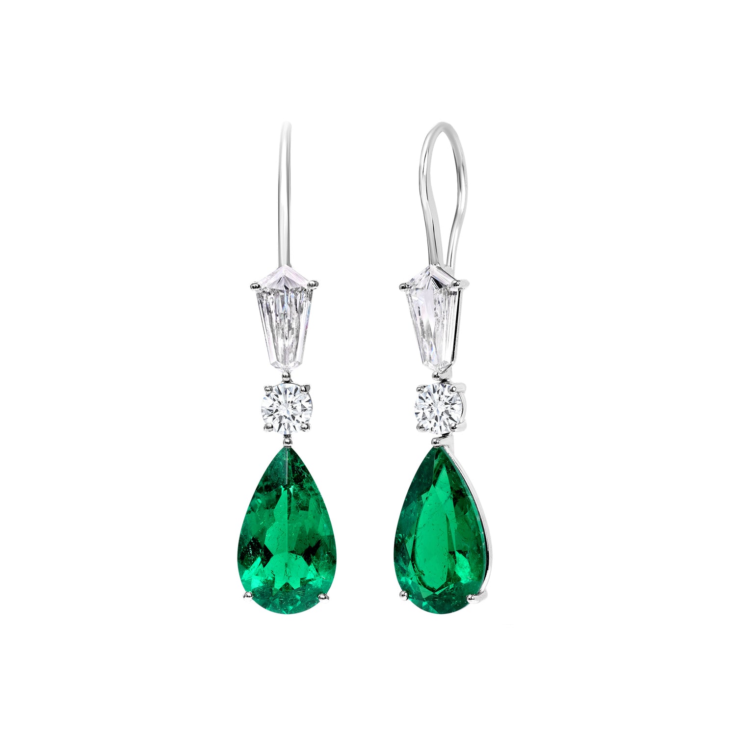 Each earring features a captivating Colombian emerald, renowned for its intense green hue and exceptional clarity, delicately suspended from a dazzling diamond stud. Above each emerald are shimmering diamonds, adding a touch of sophistication and luxury to the design.