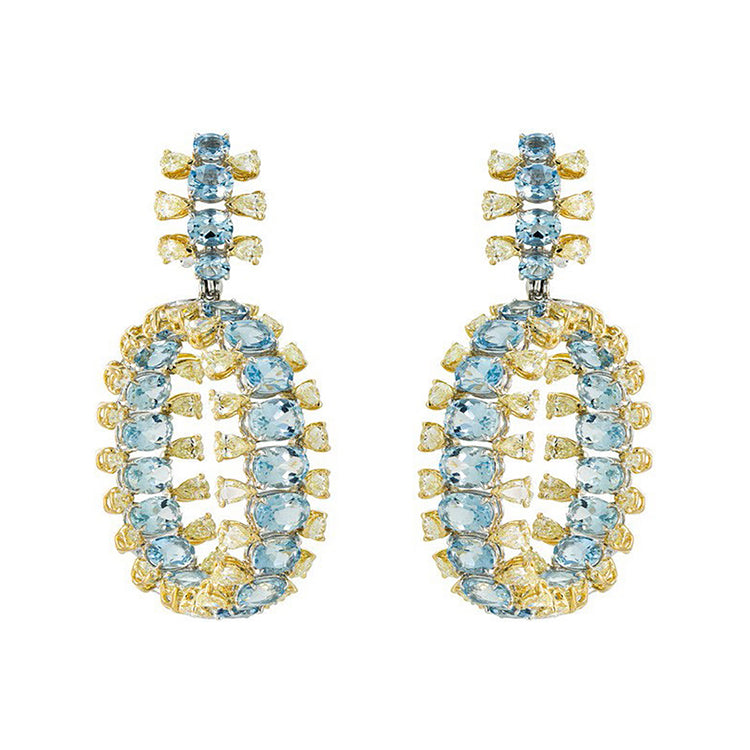 Etho Maria Aquamarine Yellow Diamond Diem Earrings from the Diem collection. These exquisite earrings showcase striking aquamarine stones paired with luminous yellow diamonds. Crafted in 18K white and yellow gold, they offer a perfect blend of elegance and modern flair. Ideal for elevating any outfit with a touch of luxury.