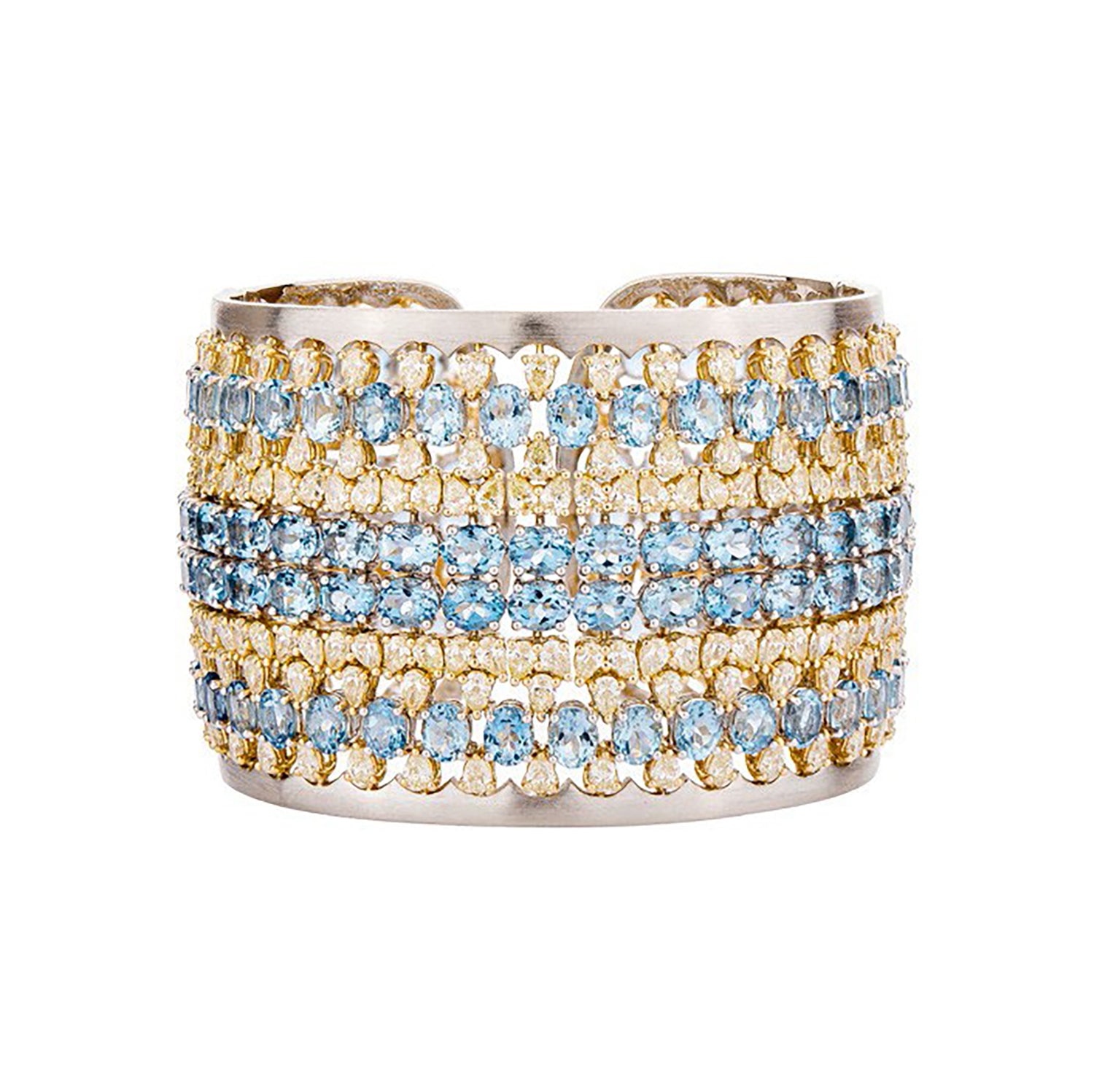 MyEtho Maria Aquamarine Yellow Diamond Layered Diem Bangle Bracelet from the Diem collection. This stunning bracelet features vibrant aquamarine and yellow diamonds set in 18K white and yellow gold. Its layered design adds depth and elegance, making it a luxurious addition to any jewelry collection.