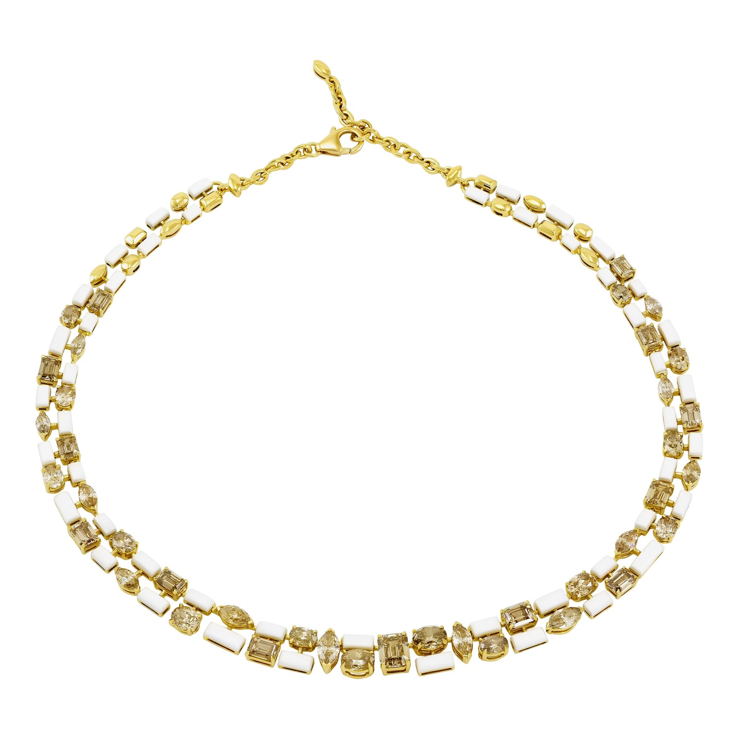 Etho Maria Hand-Carved Ceramic and Brown Diamond Mosaic Multishape Necklace from the Mosaic collection is a stunning blend of artistry and luxury. Crafted in 18K yellow gold, this necklace features intricate ceramic work and brilliant brown diamonds, offering a distinctive and elegant design. A striking piece that showcases Etho Maria's signature style.
