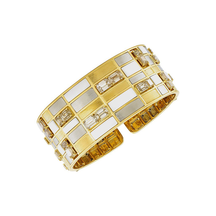 Etho Maria Hand-Carved Ceramic Yellow Gold and Platinum Brown Diamond Checkered Mosaic Cuff Bracelet