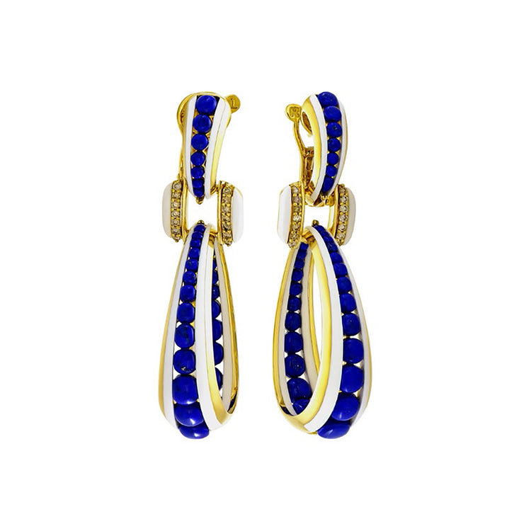 Etho Maria Lapis and Brown Diamond Hand-Carved Ceramic Cabouchon Drop Earrings from the Cabouchon collection. These stunning earrings feature vibrant lapis lazuli and intricately crafted ceramic, adorned with rich brown diamonds. Set in luxurious 18K yellow gold, they offer a captivating blend of color and elegance, perfect for any occasion.