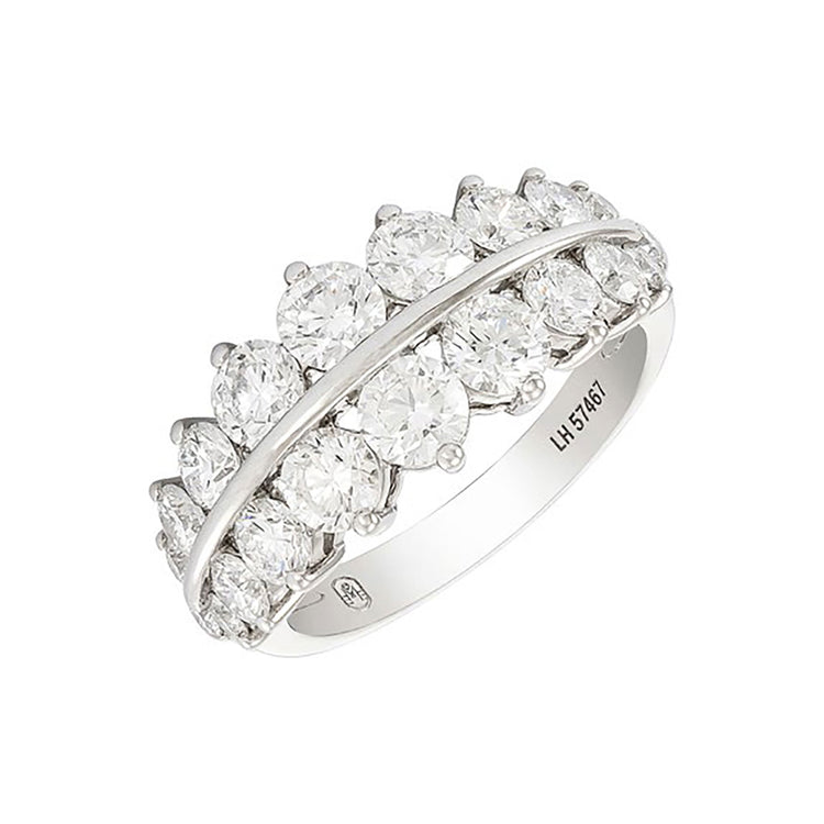 Etho Maria Two Row Graduated Diamond Gemini Ring from the Gemini collection. Crafted in 18K white gold, this elegant ring features two rows of graduated diamonds that shimmer with brilliance. The sophisticated design highlights the beauty of the diamonds, offering a timeless look that balances luxury and refinement. Perfect for adding a touch of elegance to any occasion.
