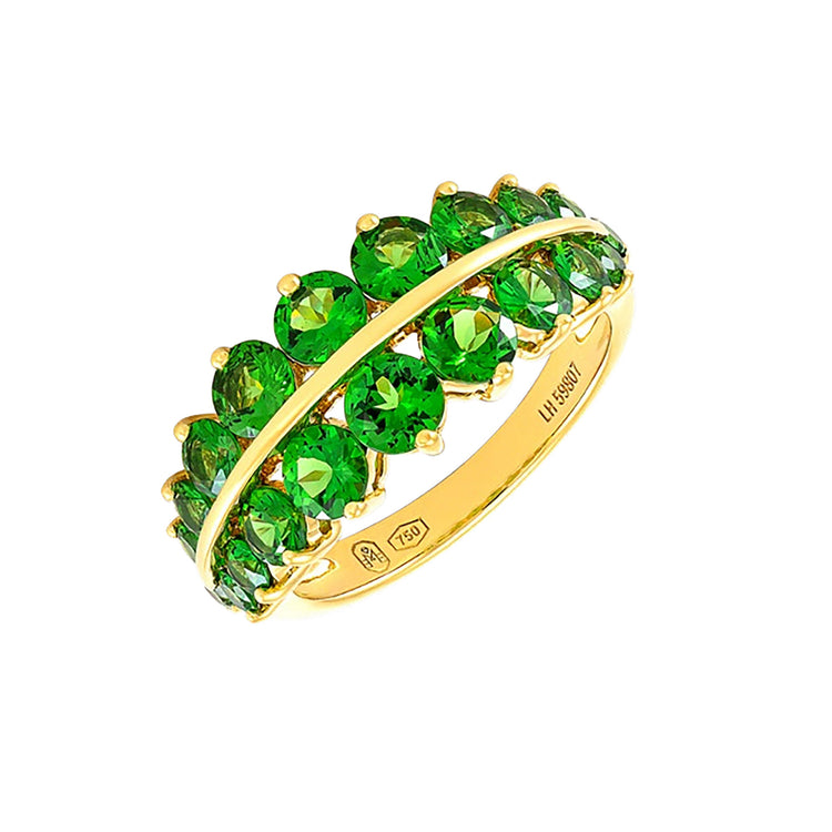 Etho Maria Two Row Graduated Tsavorite Gemini Ring from the Gemini collection.This striking ring showcases two graduated rows of vibrant tsavorite, set in luxurious 18K yellow gold. The bold design and intricate craftsmanship make it a standout piece, perfect for adding a pop of color and elegance to any ensemble. A timeless statement for the modern jewelry lover.