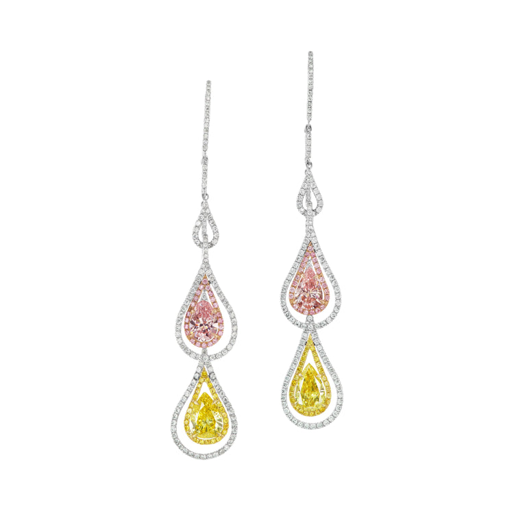 When you mix Fancy Pink Diamonds, Fancy Vivid Yellow Diamonds, and some perfect White Diamonds, a Spectacular Design you get these exquisite earrings meant to sparkle on any occasion.