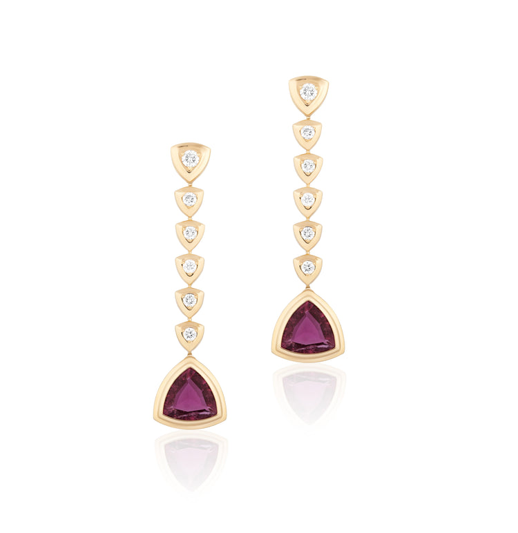 These elegant drop earrings in yellow gold feature sophisticated trillion-cut rubellite stones and 12 white diamonds. The intense purplish-red hue will bring a distinctive look to any outfit.