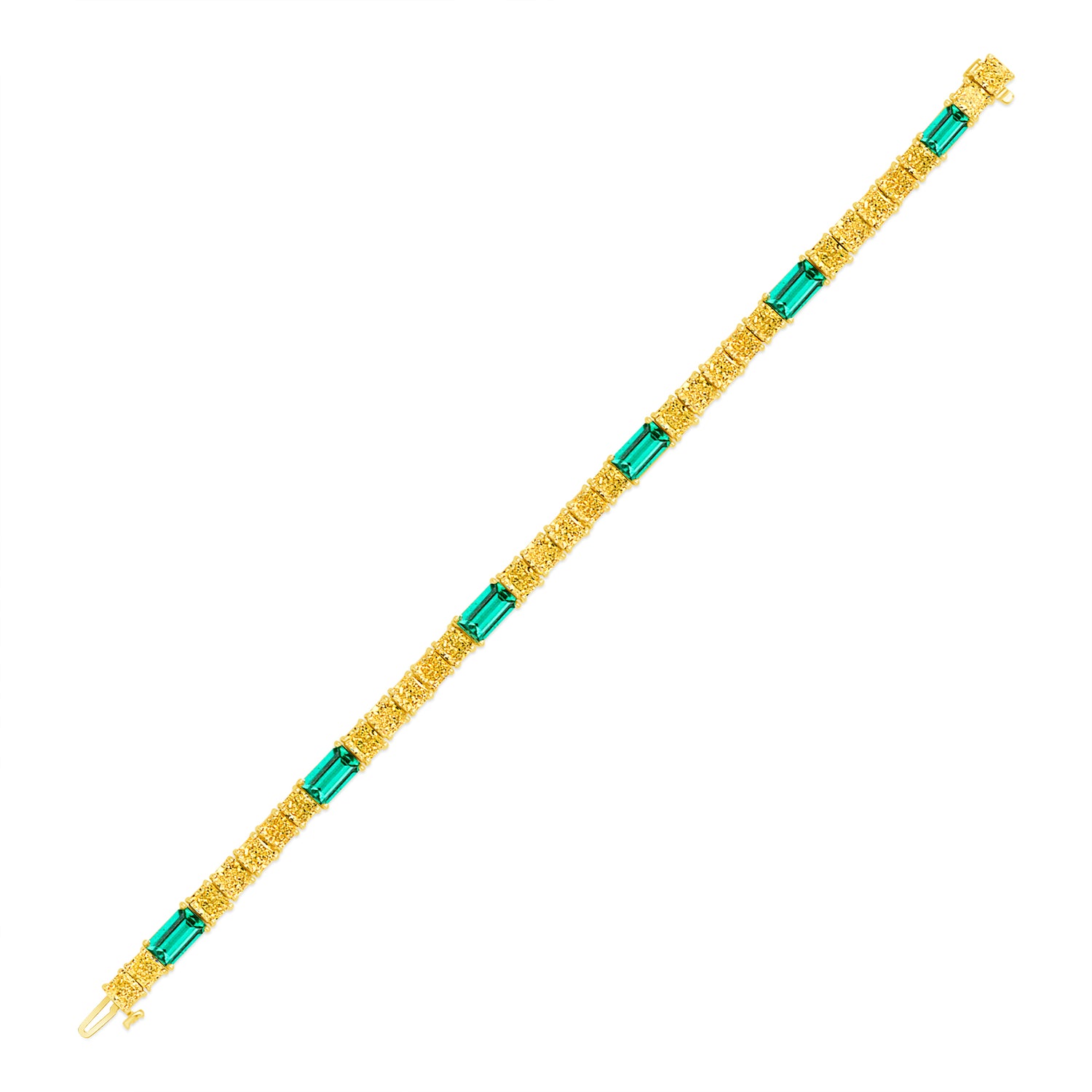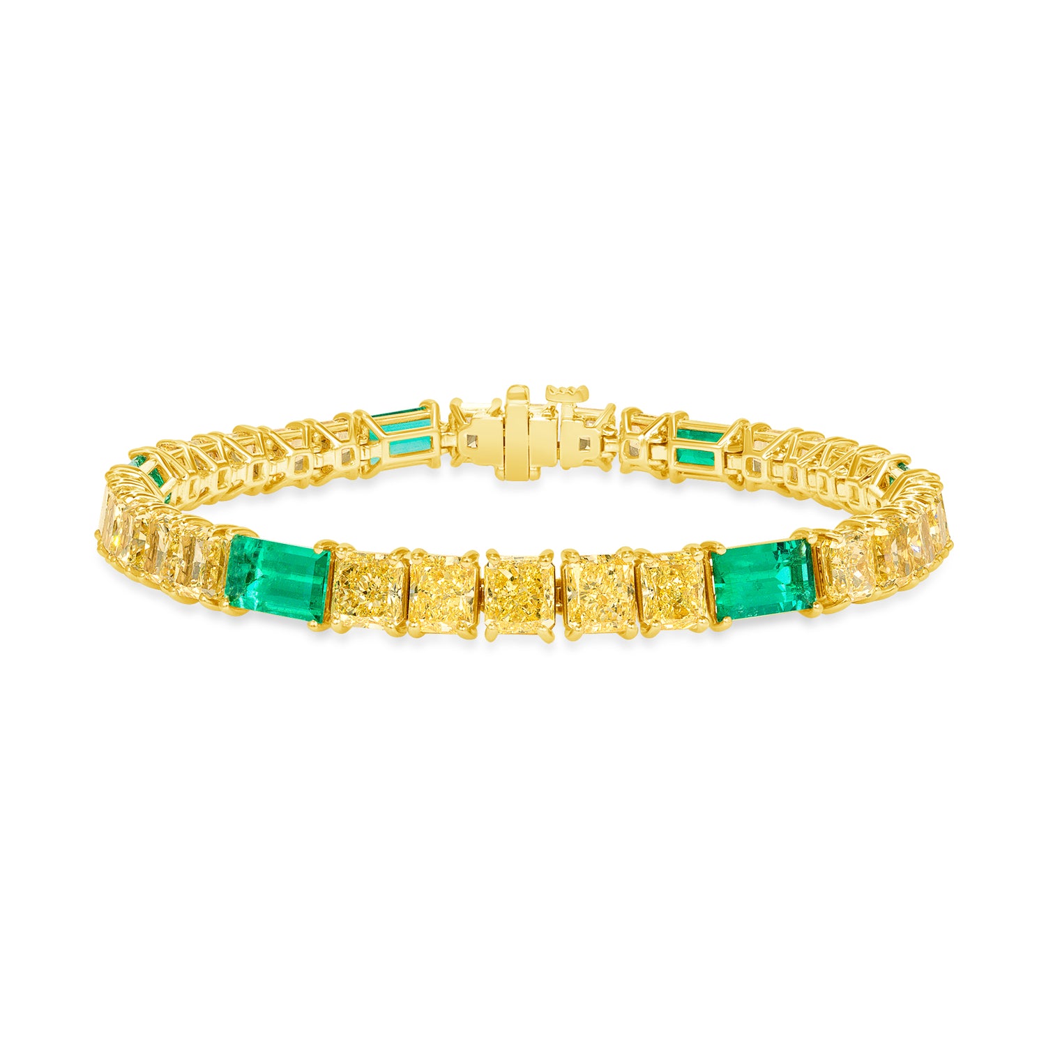 This stunning bracelet features 28 radiant-cut fancy yellow diamonds, each certified by GIA with VVS-SI clarity. The radiant yellow diamonds, renowned for their intense color and exceptional brilliance, captivate the eye with their warm and luminous glow. Complementing the yellow diamonds are six baguette-cut emeralds, adding a lush green accent to the ensemble.