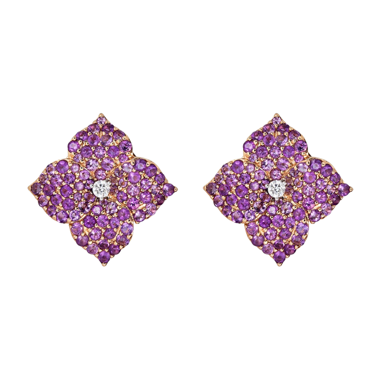 The Fiore Amethyst Flower Earrings, where four petal flowers adorned with pave purple amethysts take center stage The iconic design is the hallmark of Piranesi and a symbol of perfection. Each delicate petal whispers a story of elegance and grace, capturing the vibrance of the purple colored gemstones.
