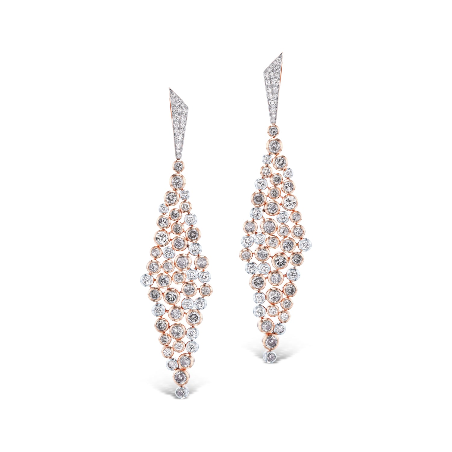 A captivating combination of over 11 carat total weight of gray and white diamonds, set in rose gold, embellish your ear with a unique and stand-out look, perfect for completing any outfit.