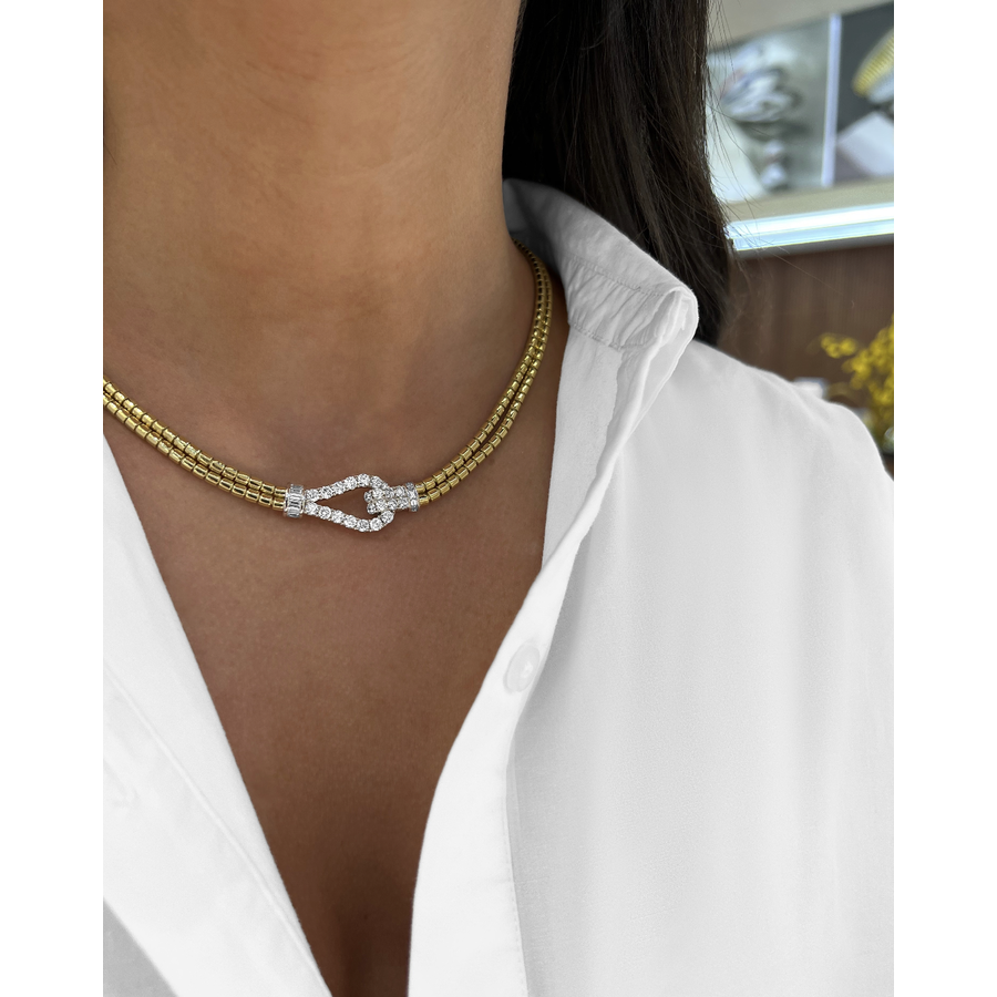 Two layers of solid 18k yellow gold gracefully ascend around the neck, converging in a sculptural lasso design that is adorned with round brilliant diamonds. One side appears to elegantly grasp the loop, evoking a captivating sense of tension, and movement.