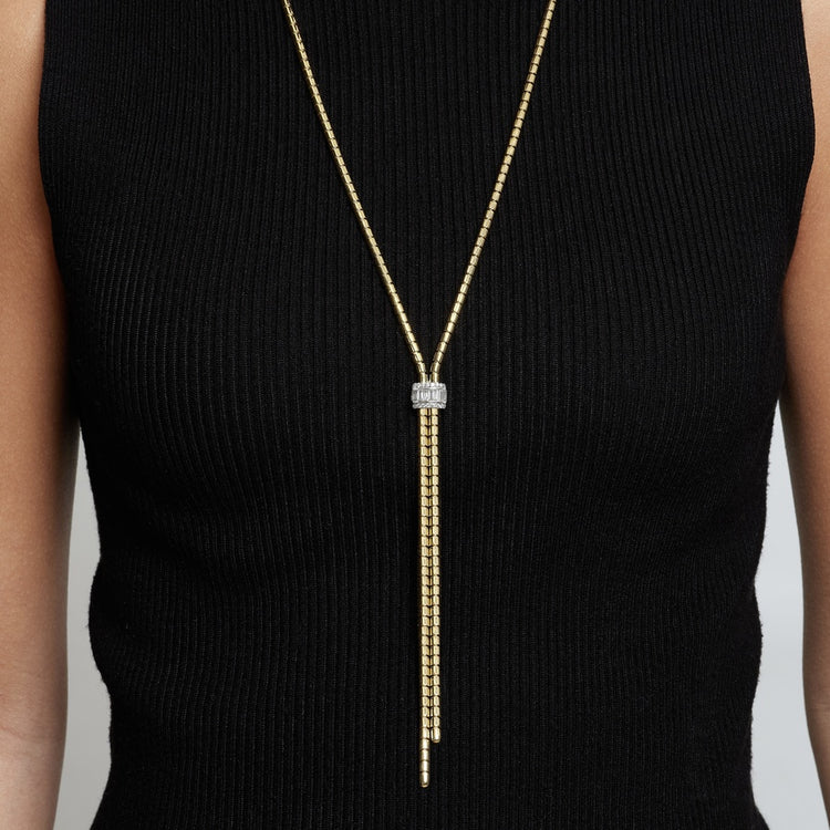 A beautiful solid 18k yellow gold tube chain forms a clean V-shape, gracefully brought together by a stationed baguette rondel. This refined detail unites the two rows, allowing them to glide effortlessly into a sleek, flowing lariat silhouette. (Long Version)