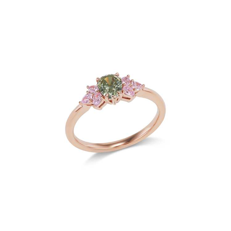 A pear-shaped Fancy Green Diamond takes center stage, sparkling in hues of gray-green to yellow-green in this delicate ring. Six Fancy purple-pink diamonds flank the center stone giving this a nature-inspired look perfect for a glamorous garden party.