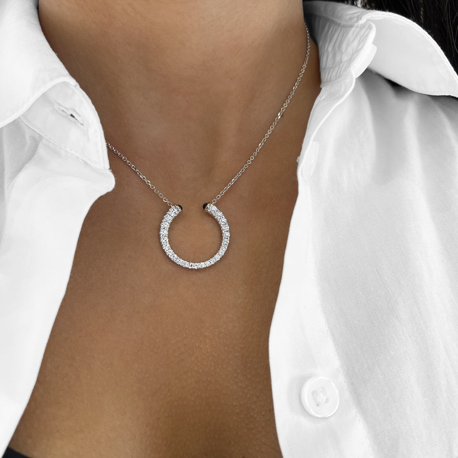 Graduated diamonds are expertly set and sculpted into a graceful horseshoe shape, gently tapering downward in brilliance. The design is crowned with two sapphire semi-circles, adding a bold touch of color and symmetry. Crafted in radiant 18k white gold, this piece blends timeless elegance with a modern, artistic twist.
