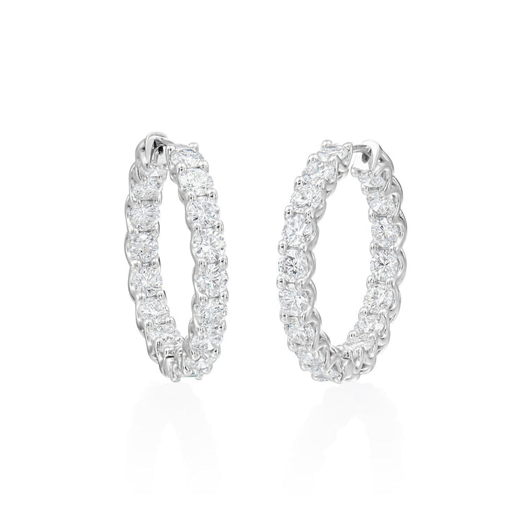 The unique U-prong setting adds a contemporary touch to these classic hoop earrings, ensuring that each diamond is prominently displayed, allowing for maximum light refraction and creating an alluring play of sparkle and fire.