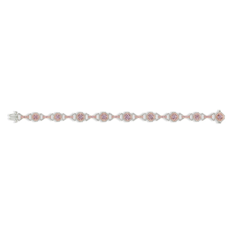Crafted with meticulous attention to detail, this exquisite bracelet features a dazzling array of light pink diamonds meticulously set in gleaming rose gold and platinum. Each diamond, chosen for its exceptional color and clarity, glimmers with unmatched brilliance, creating a mesmerizing display of light and color. The delicate link design adds a touch of sophistication, ensuring this bracelet effortlessly enhances any ensemble, from casual chic to night event.