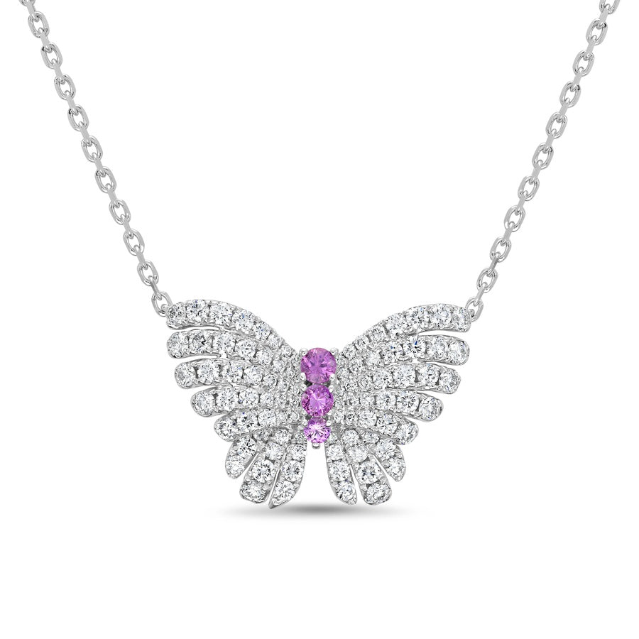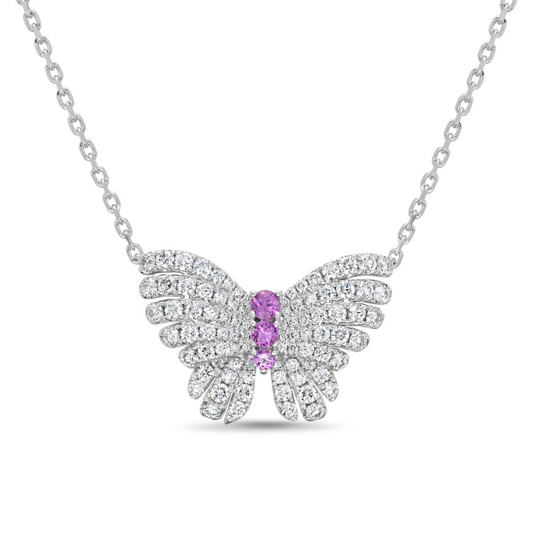 Arms of 18k white gold come together to form graceful butterfly wings, adorned with brilliant white diamonds and converging at a body of vivid pink sapphires. Sculptural and radiant, this butterfly pendant captures the delicate essence of nature in a bold, wearable work of art.